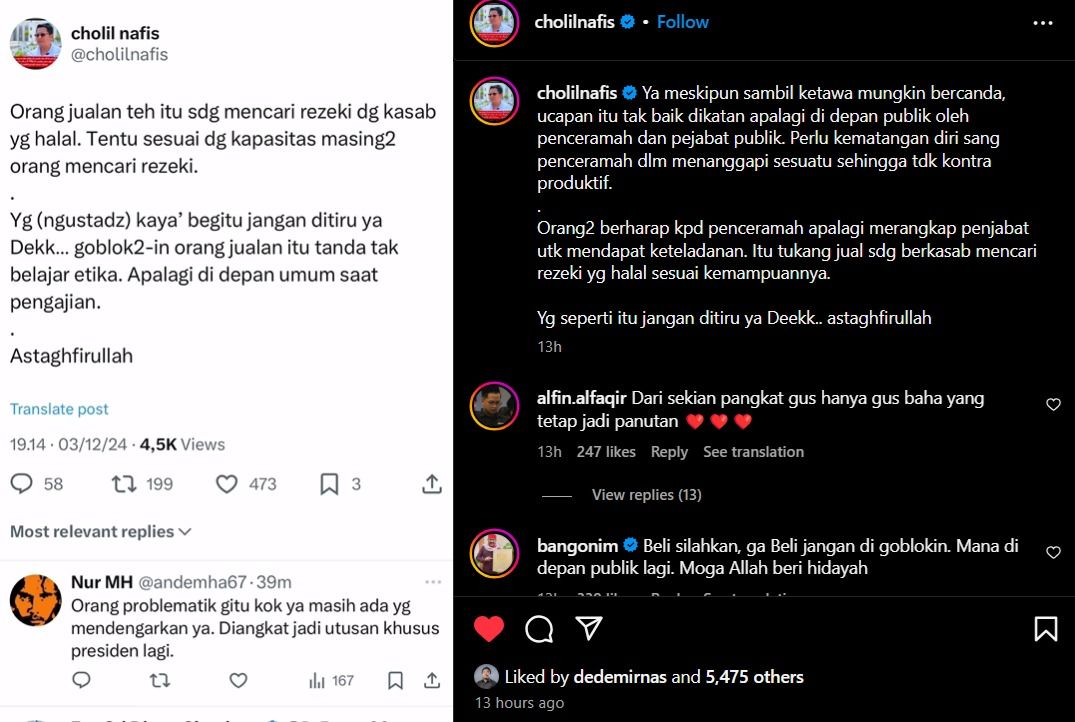 "Meskipun sambil tertawa mungkin bercanda, ucapan (Gus Miftah ke penjual es teh bakul) itu tidak baik dikatakan, apalagi di depan publik oleh penceramah dan pejabat publik," ujar Cholil Nafis melalui akun Instagram @cholilnafis, pada Selasa, 3 Desember 2024.