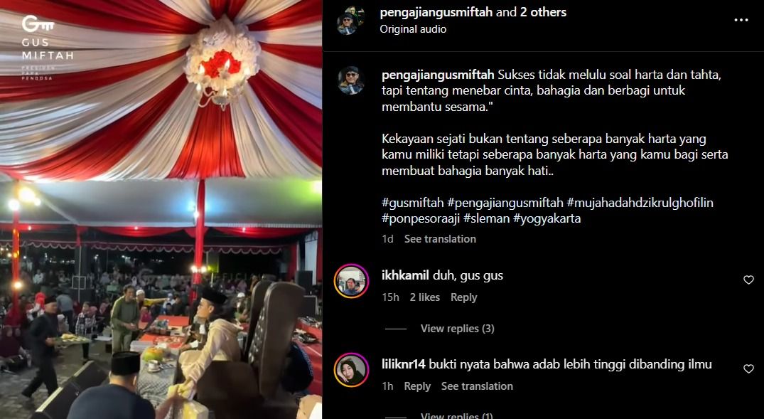 "Kekayaan sejati bukan tentang seberapa banyak harta yang kamu miliki, tetapi seberapa banyak harta yang kamu bagi serta membuat bahagia banyak hati," ucap Gus Miftah.